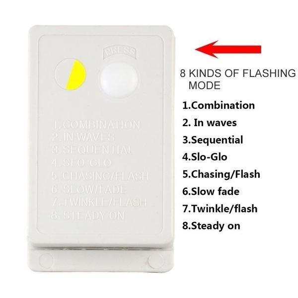 - 8 mode settings: combination. in waves. sequential. slo glow. chasing/flash. slow fade. flash and steady on.