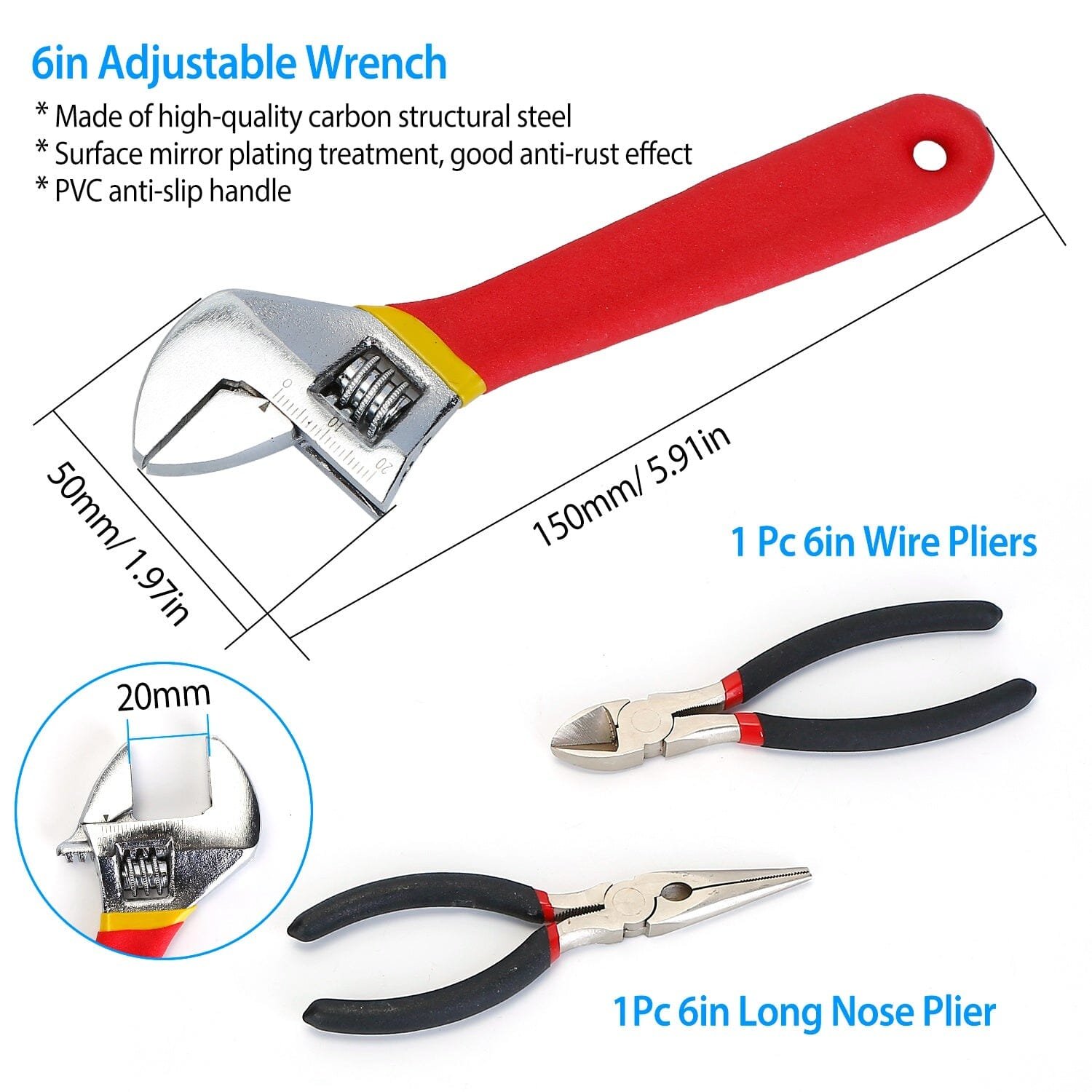 • Precision Craftsmanship: Made of high-grade steel. the durable construction provides ultimate precision and longer lifetime; Anti-slip grip handles of the wrench. claw hammer. pliers are for extra comfort use.