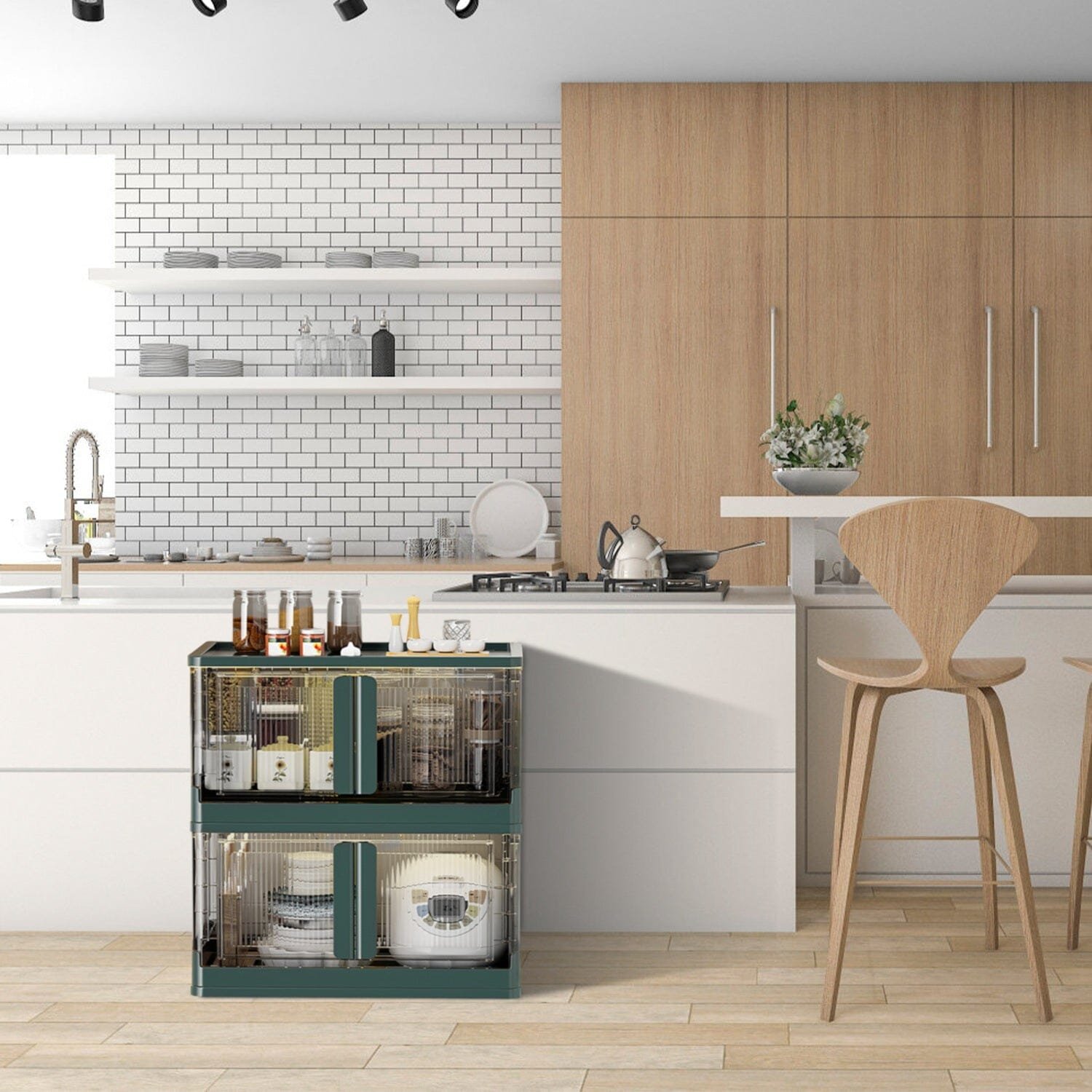 - Easily Fetch Items From Top & Front: The folding storage organizer is able to open in two ways. You can open lid on the top or open from the front door. The front door built in lock buckles. rotating the handles in and out to control the doors lock and unlock. ensure the doors not open when moving this cabinet. The front door makes it easy to access to everything inside without having to pull everything down or removing the things on the top lid. Top cover keeps things from being exposed to dust.