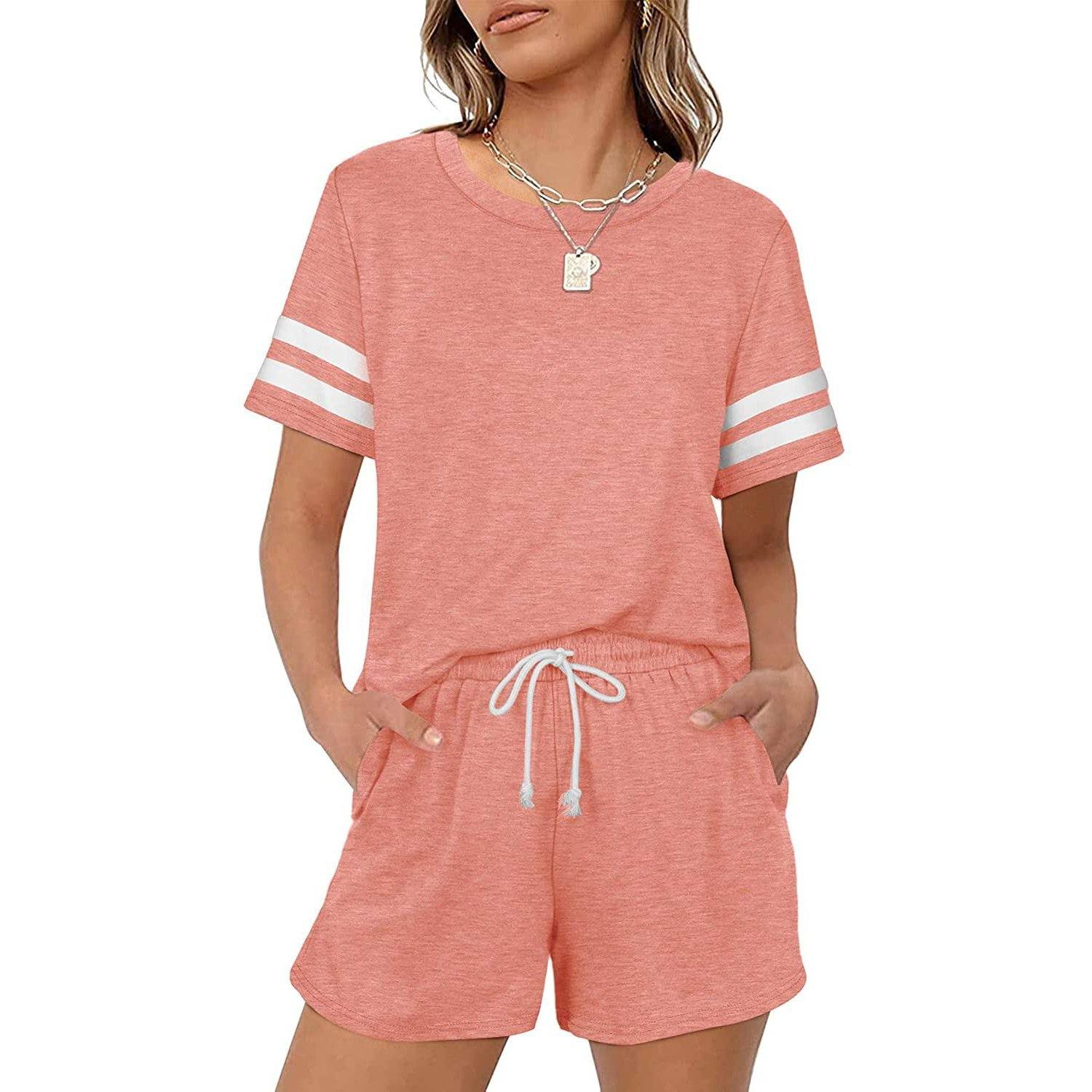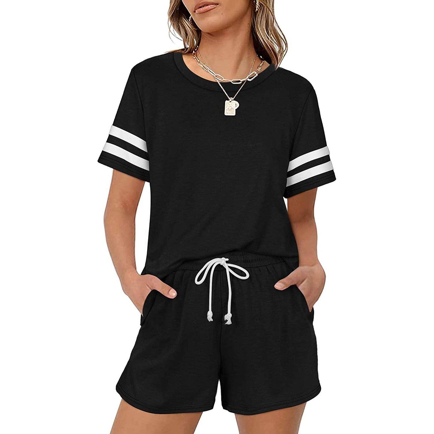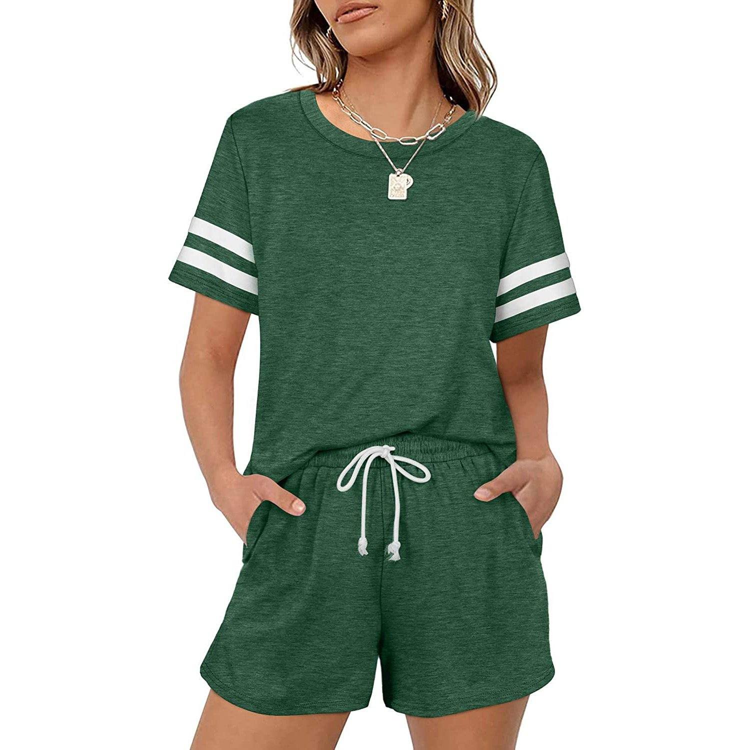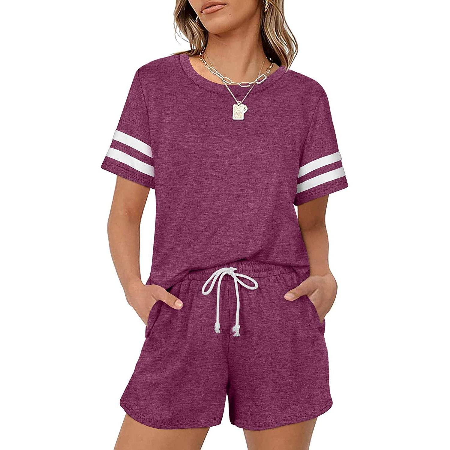 - 2 piece loungewear set. short sleeve. loose fit. crew neck. solid color. stripe pattern. drawstring elastic waistband shorts set for a relaxed look