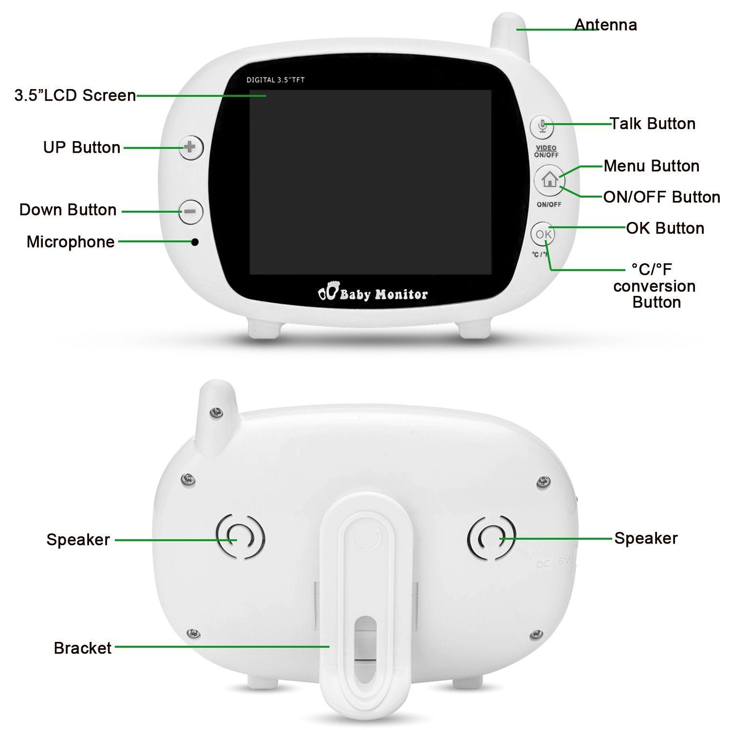 - Temperature detection function and real-time display on the LCD monitor to keep the environment comfortable and provide baby an enjoyable sleeping environment.