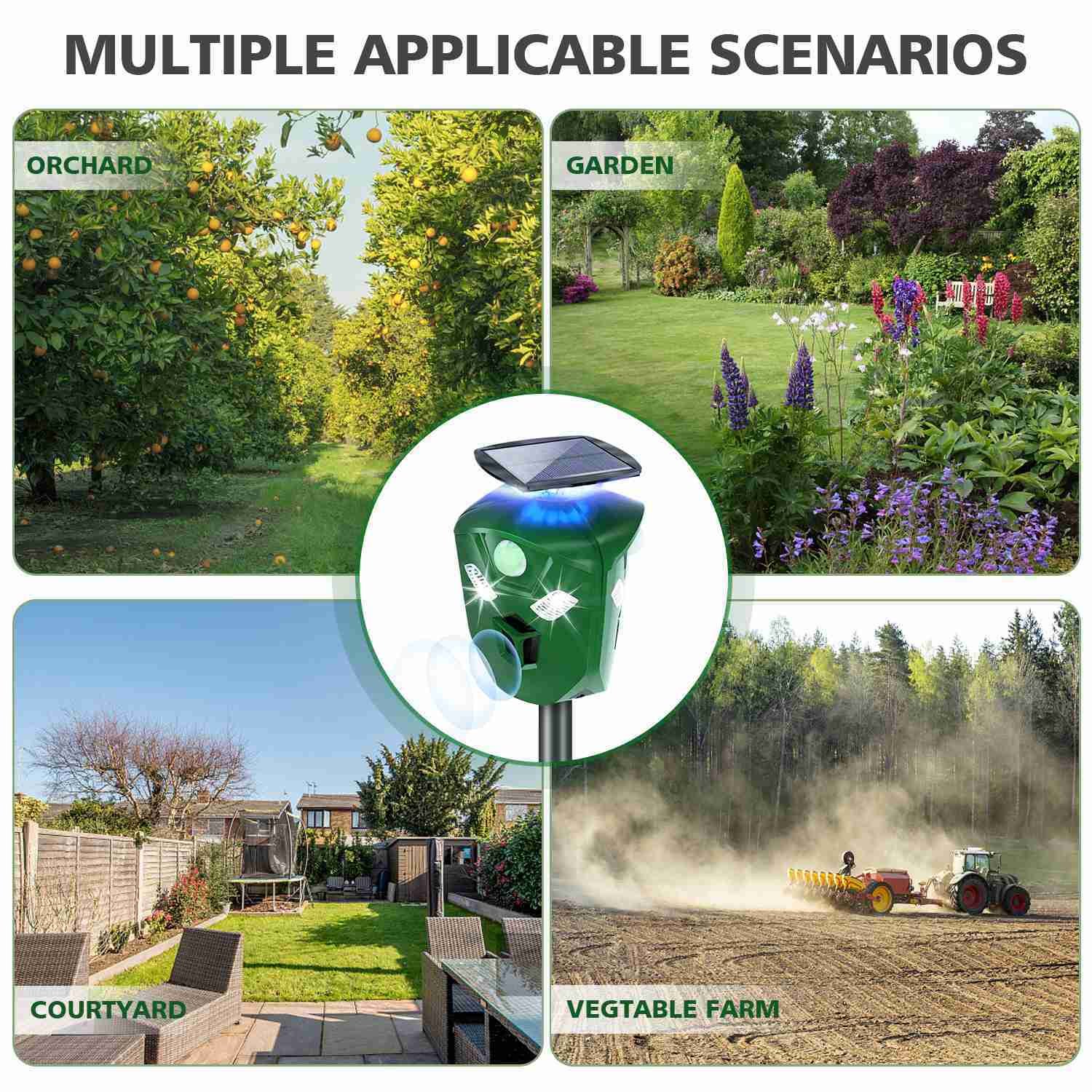 Our solar animal repeller provides you with a perfect solution for repelling unwanted animals by emitting ultrasonic sounds and dazzling blue light that make cats. dogs. deer. squirrels. raccoons. skunks. foxes. wild boars and other animals frightened and panicked to escape. Features with 3 PIR sensors. 3 ultrasonic speakers. 6 LED flashing lights and 1 blue light. once it senses animal approaching. the device will be activated and emits ultrasonic waves and flash LED lights to drive the animal out of sensing range. Besides. it is rainproof and waterproof. which can be inserted outdoor such as gardens. farms. ponds without harm from rain and snow.