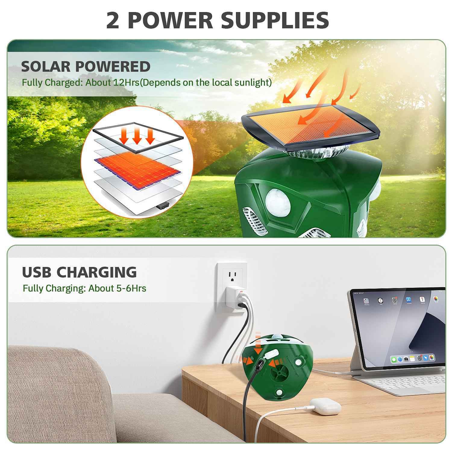 - 2 Charging Ways: Equipped with the inbuilt solar panel and rechargeable batteries. our animal repeller can be USB charging and solar charging.