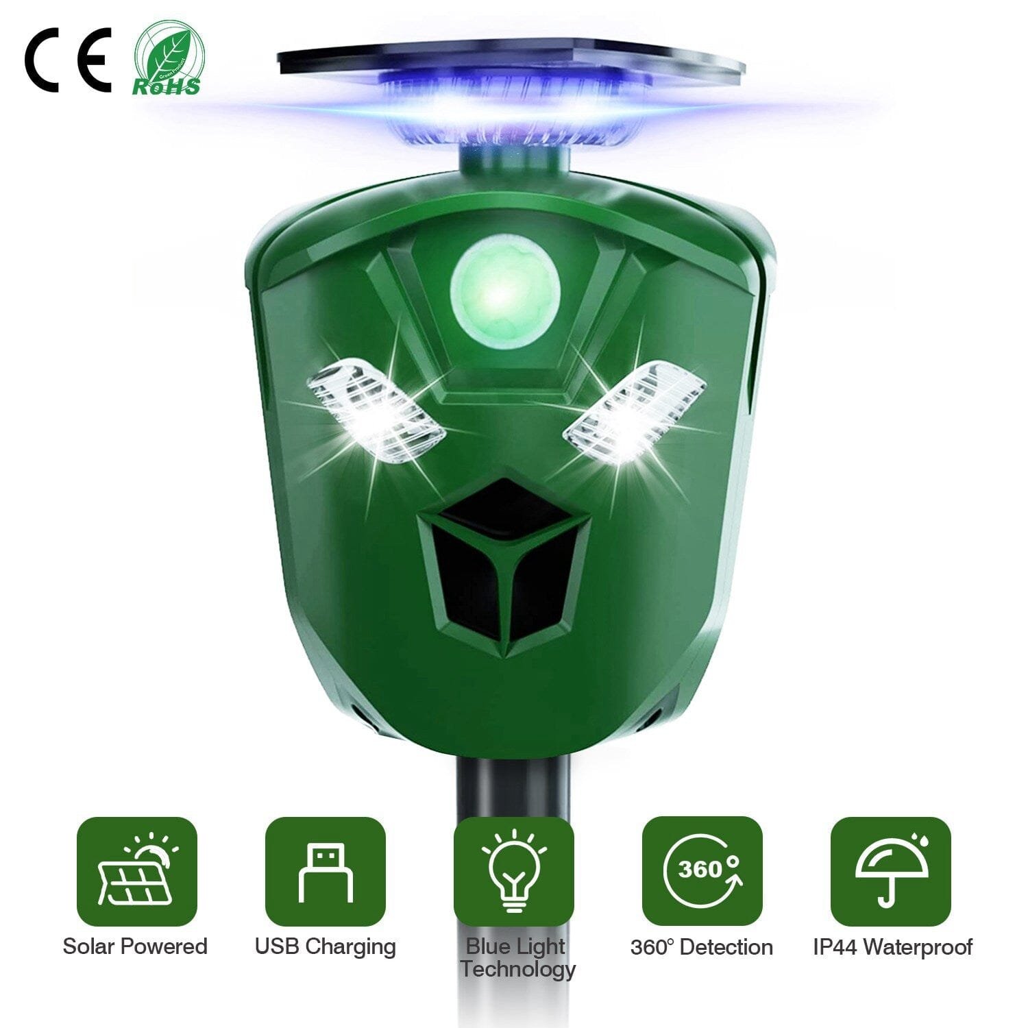 - 360?? Ultrasonic Animal Repeller: Our solar animal repeller adopts blue light repelling advanced technology to provide you with 360 degree all-round detection. Includes 3 sides. each side comes with 1 PIR motion sensor. 1 ultrasonic speaker. 2 LED flashing lights on each side. Once it senses animal approaching. the device will be activated and emits ultrasonic waves and flash LED lights to drive the animal out of sensing range.