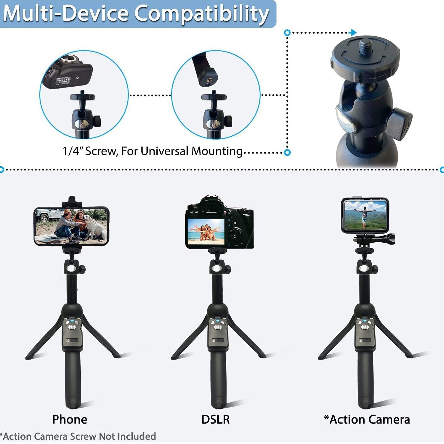 - Fast Connecting Wireless Bluetooth Remote: Use with different devices. Compatible with iPhone iOS. Android 4.3 or newer. small Digital Cameras.(*iOS has no zoom feature. Zoom works on limited Android devices. Bluetooth may be incompatible with some cameras). Remote safely secures in handle. or canbe removed.