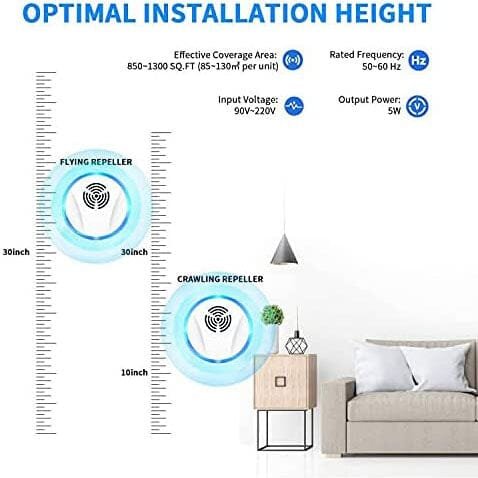 • Pest repellents are simple to use. All you do is plug pest repellent ultrasonic in an electrical outlet and it will start to repel the pests when the blue night light is on. The repeller should be placed in a location where its noise will not be affected by walls and furniture. It is recommended to install this pest repeller between 30-50 inches away from the floor for flying pests and 10-30 inches from the ground for crawling pests.