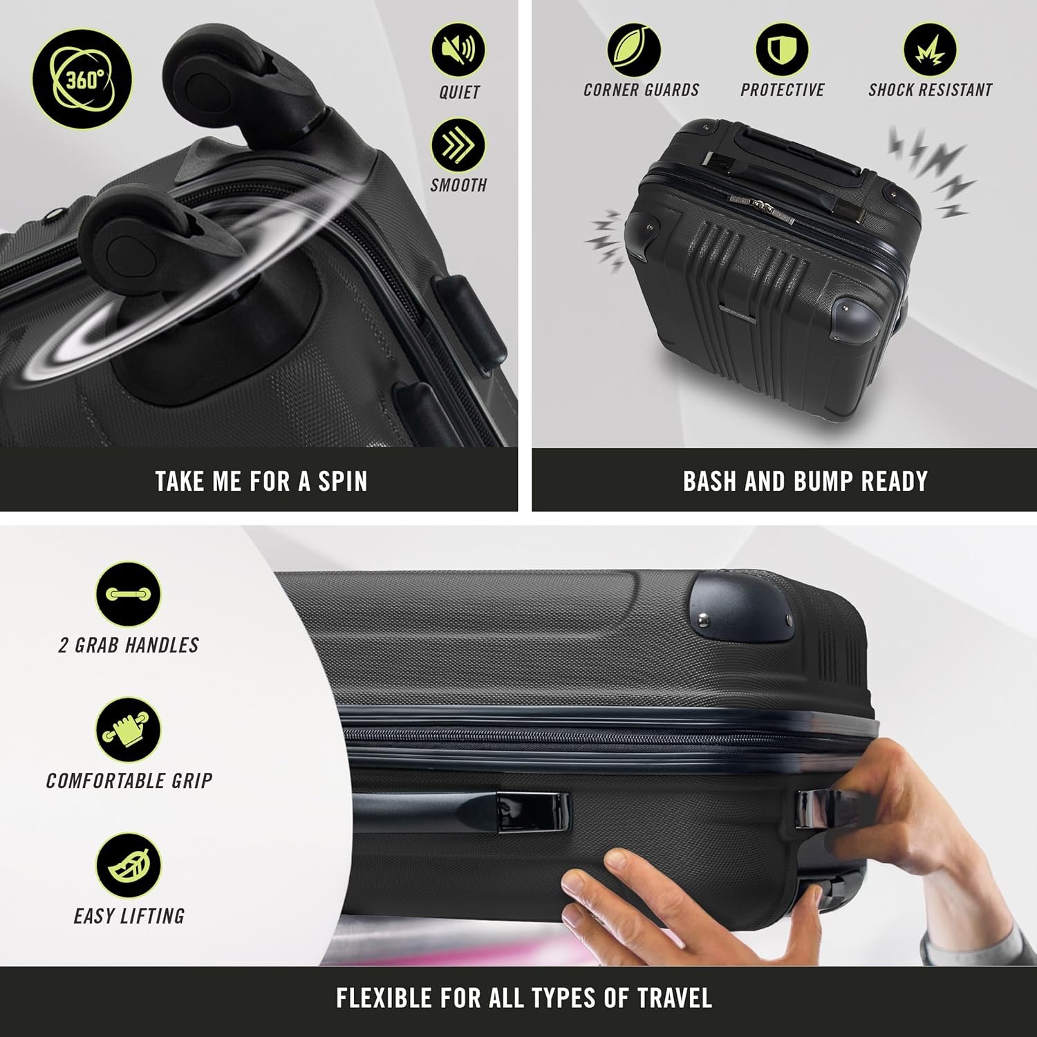 4 x 360-degree spinner wheels provide smooth, quiet, and effortless handling.