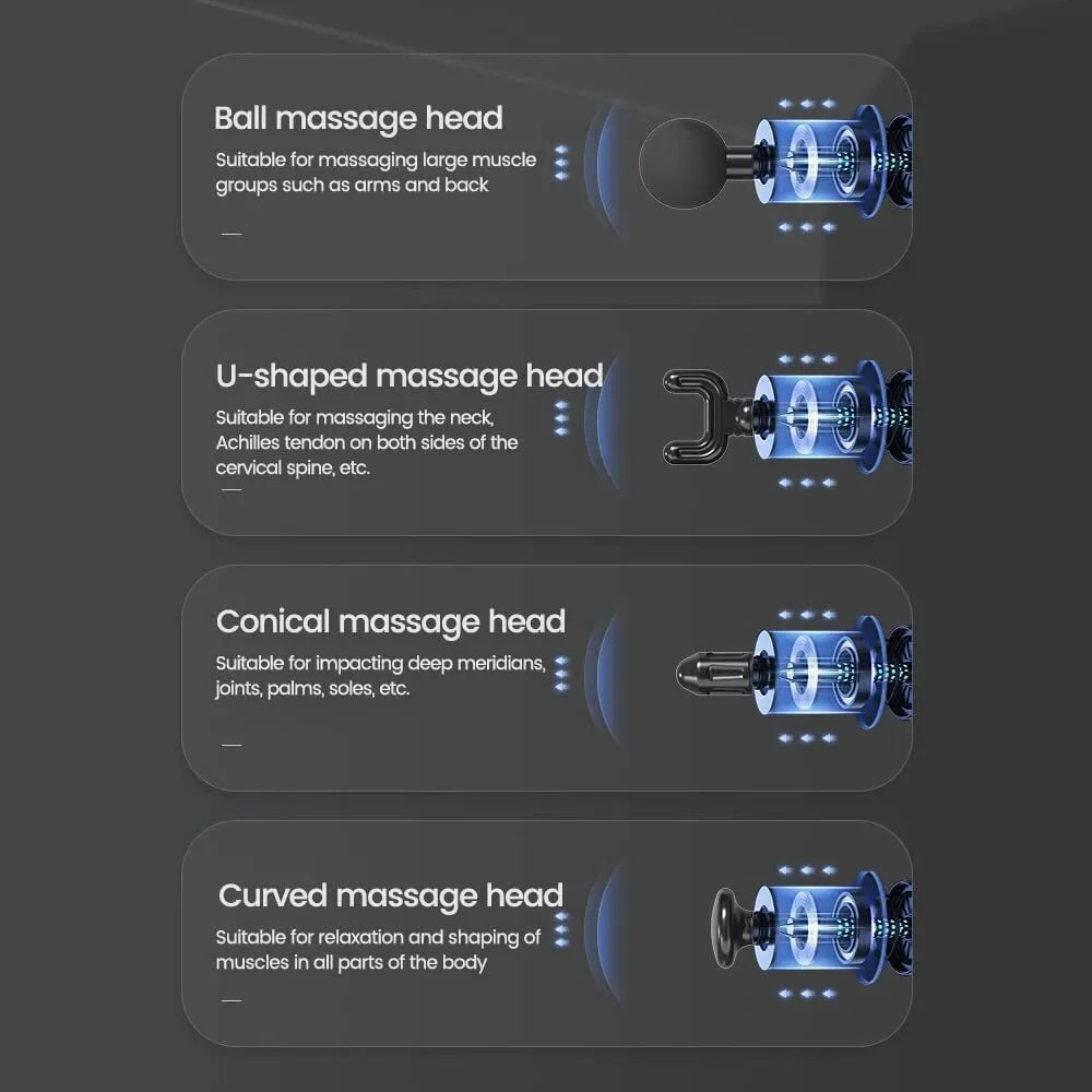 - 4 Interchangeable Heads: The massage gun comes with 4 different heads that can be easily swapped out to target specific muscle groups.