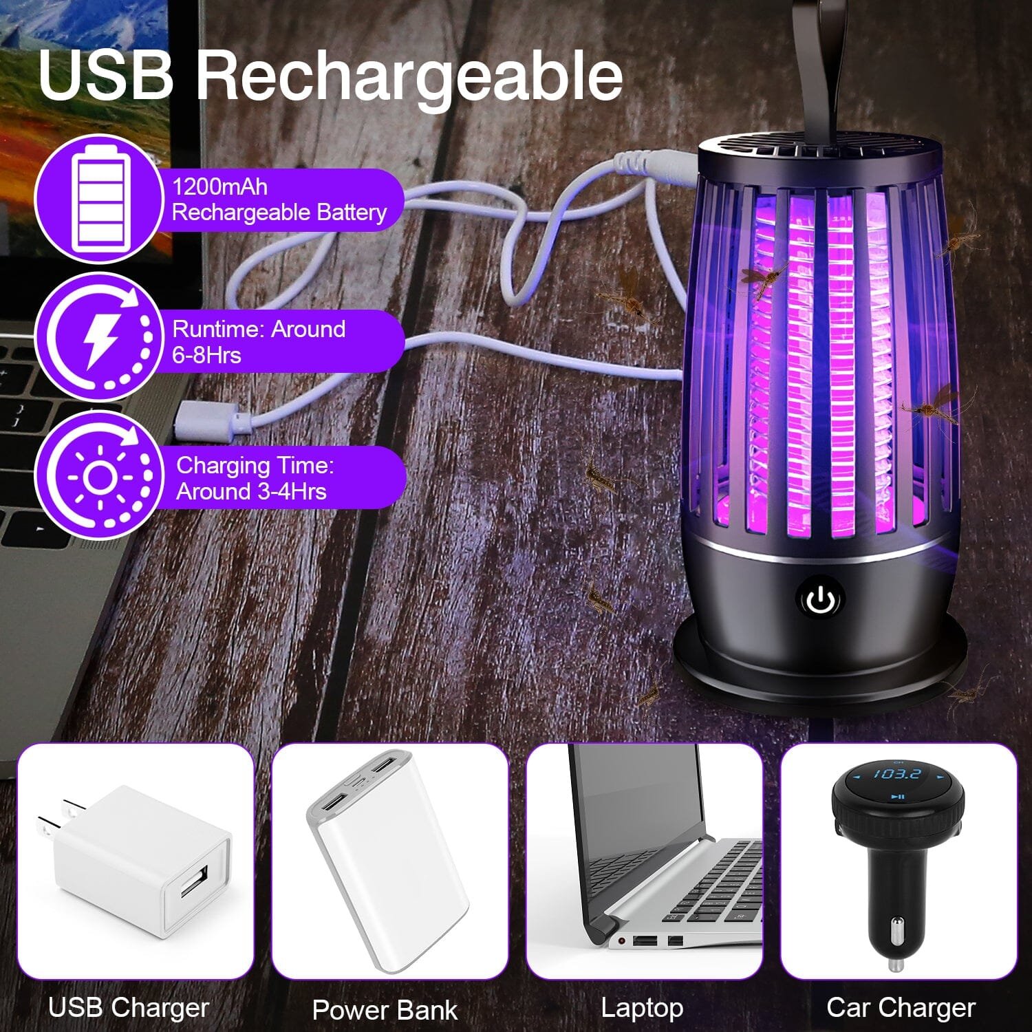 - Rechargeable & Powerful: Featured with a USB cable and 1200mAh rechargeable battery. our mosquito killer lamp keeps standby for 6 hours after 2 hours’ fast charging. Also. the lamp can realize a coverage of 150square meter/1615square feet. effectively protects your family from the annoying mosquitoes.