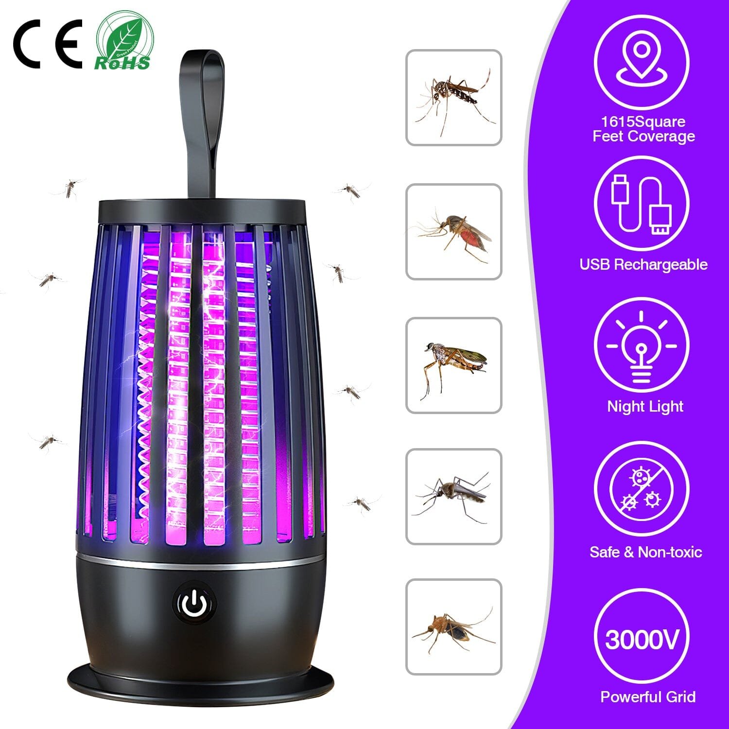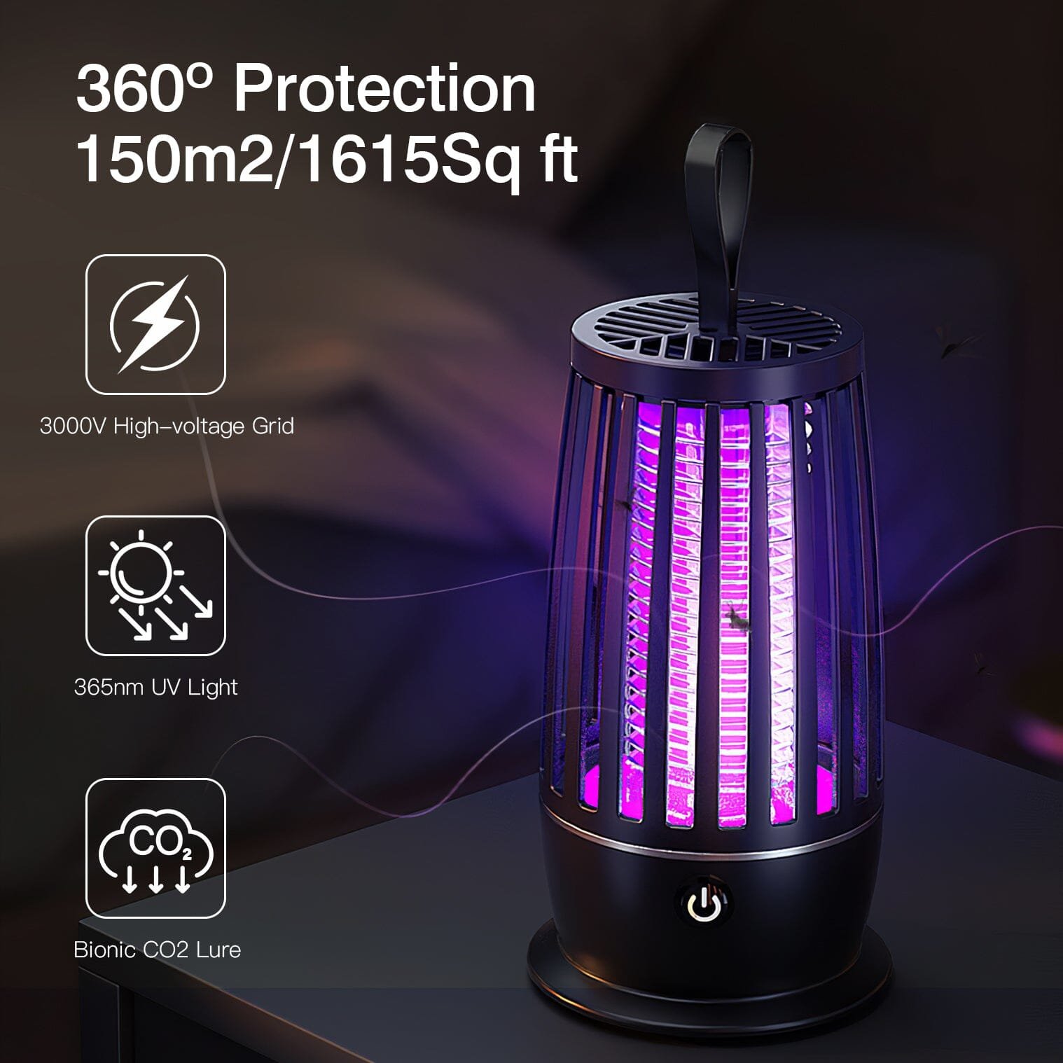 - 360 Mosquito Control: Emit 365nm UV light and imitates human body temperature to lure the annoying mosquitoes. then kill them with electric shock. Finally. the mosquitoes can be electrocuted by the 3000V high voltage.