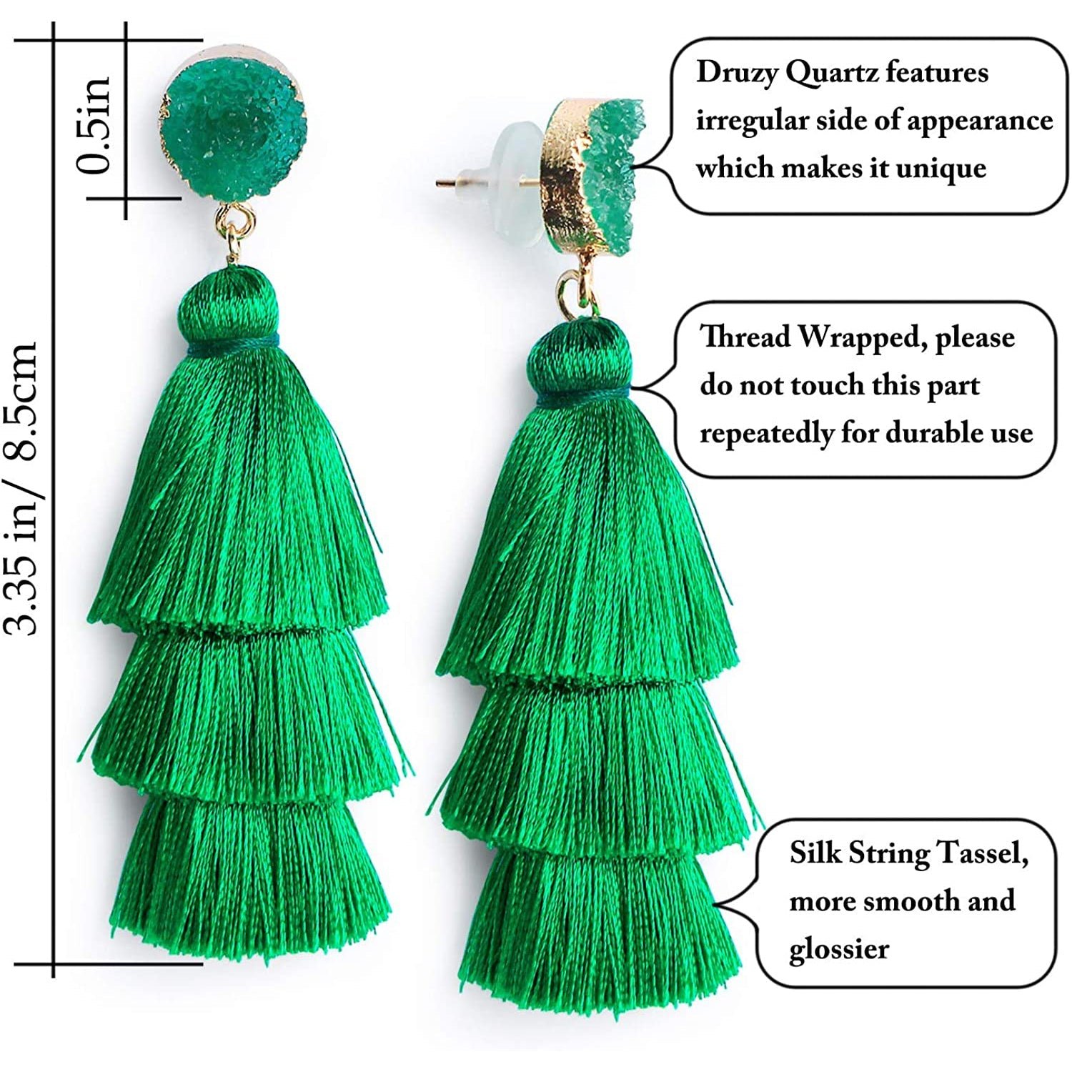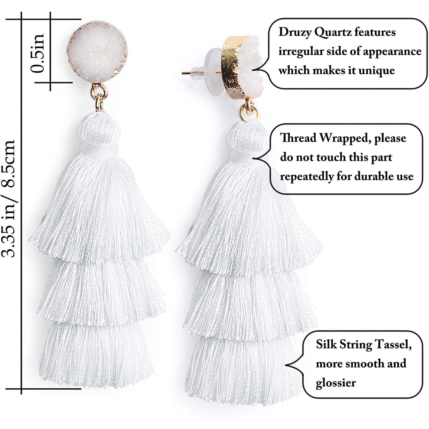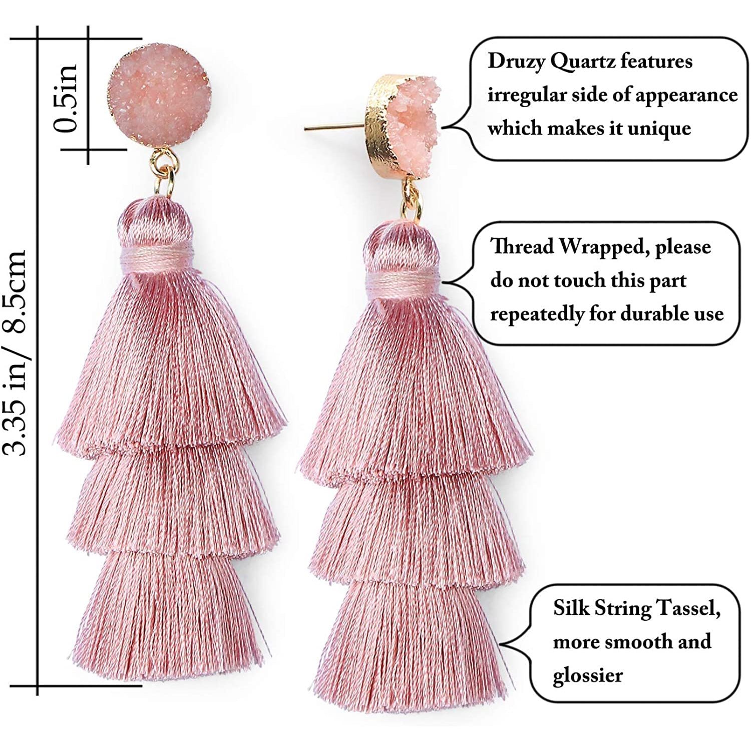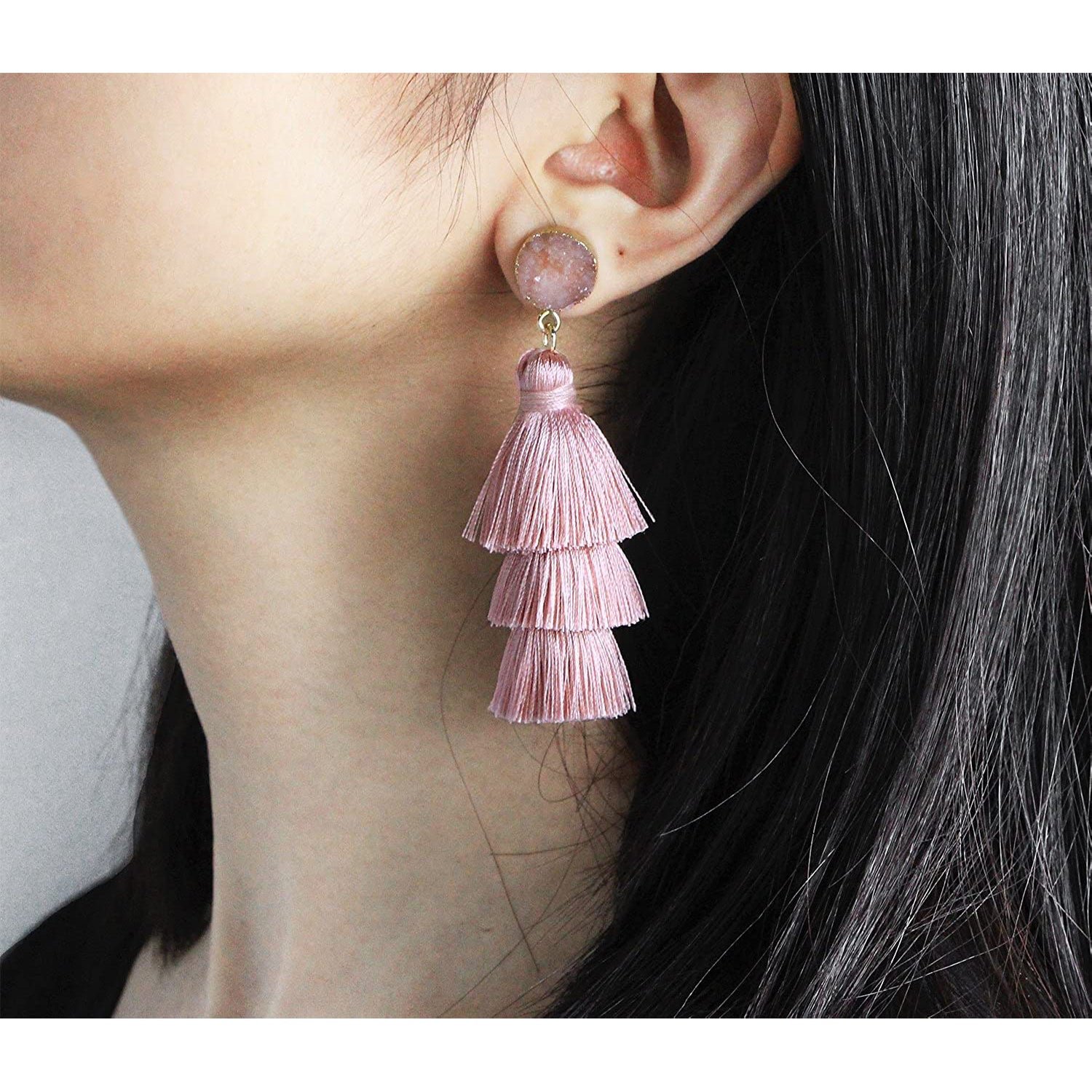 • This tassel drop dangle earring is about 3.35in / 8.5cm length. cute and elegant. It weights only about 0.4oz for a pair earring. lightweight and comfortable for wearing