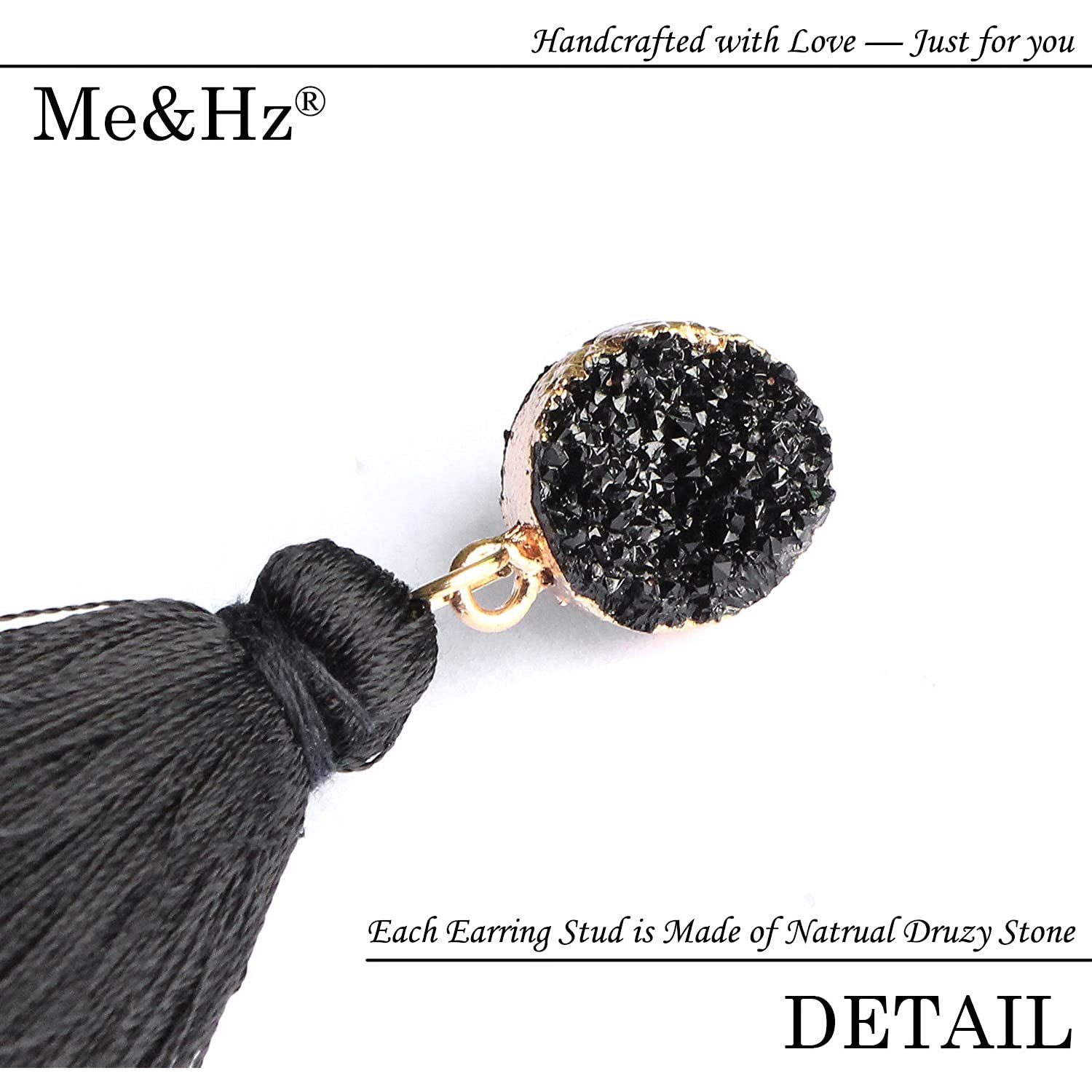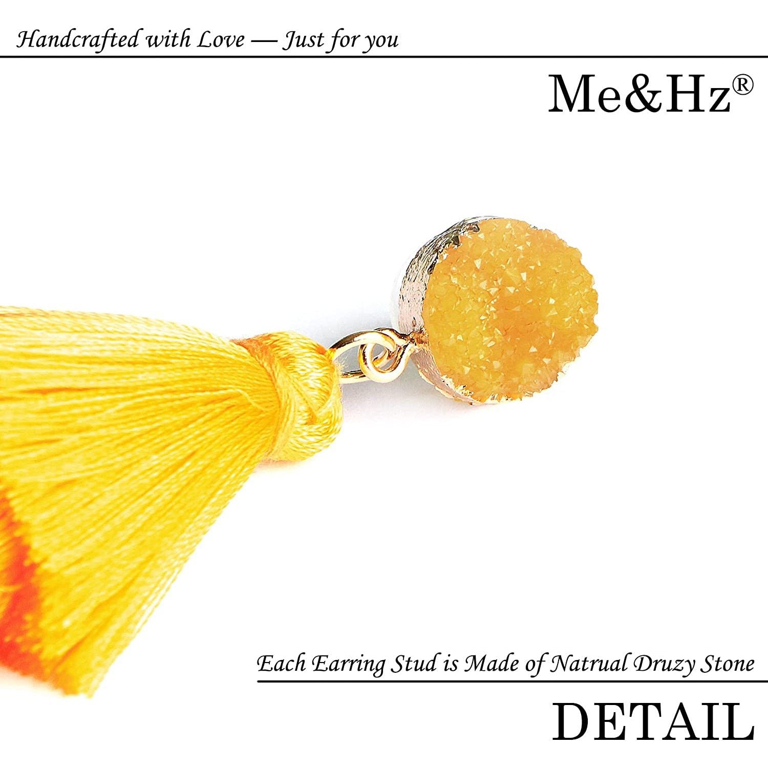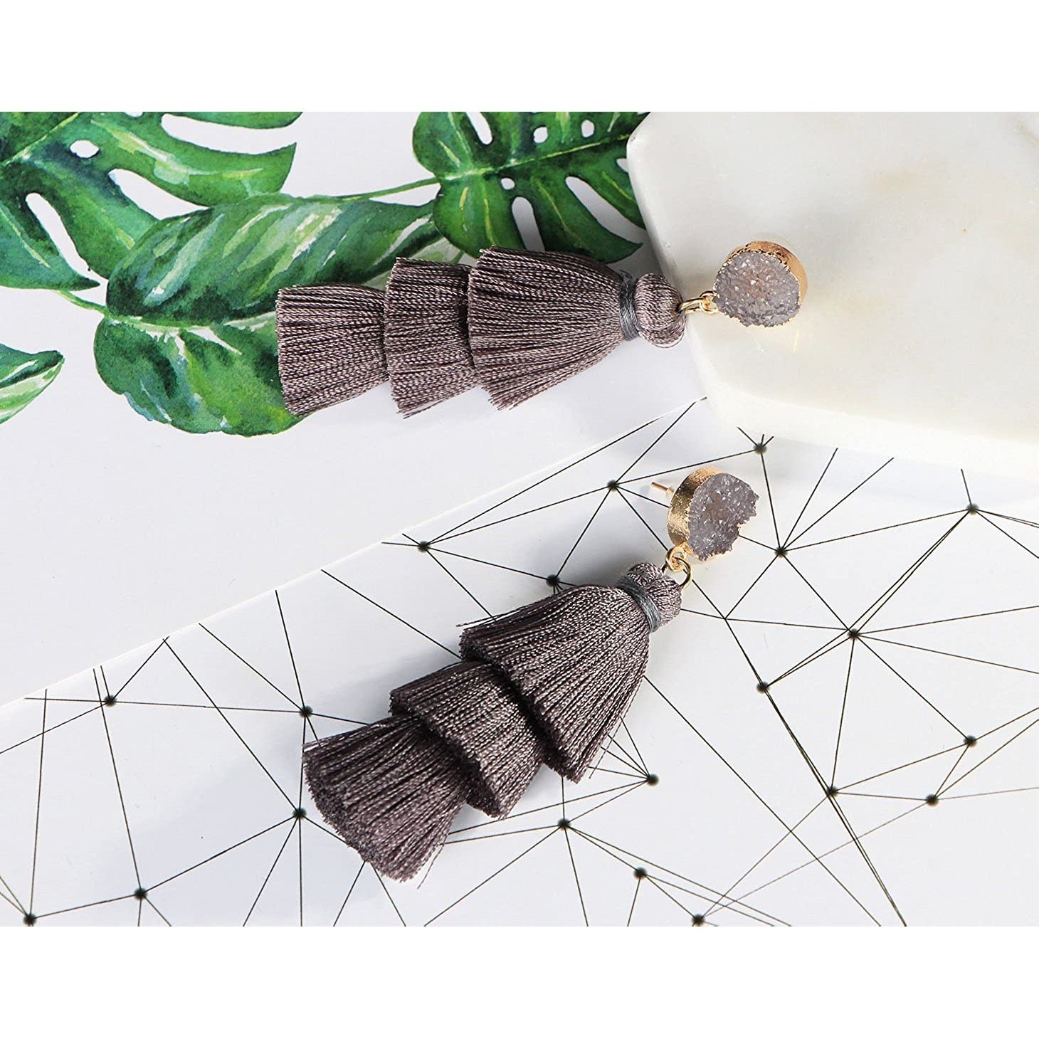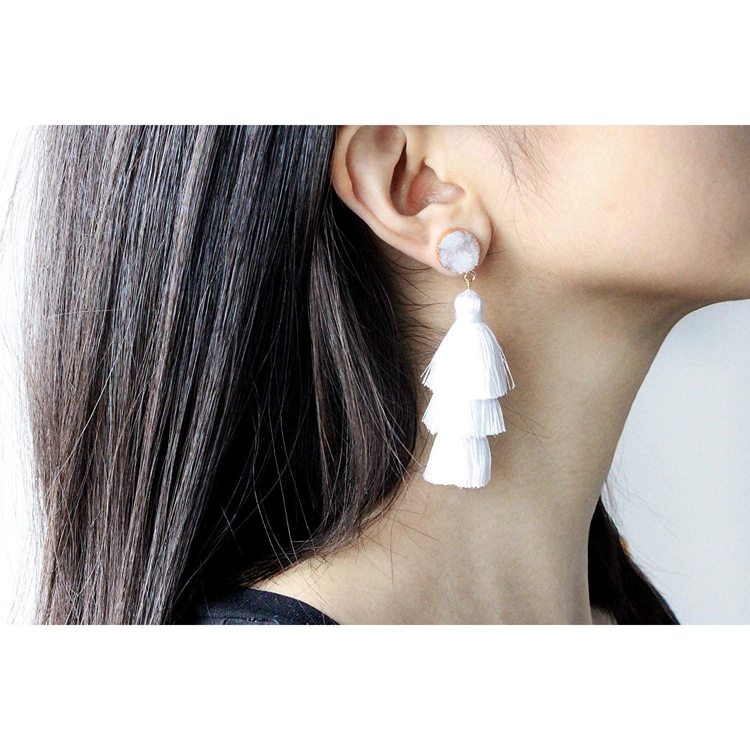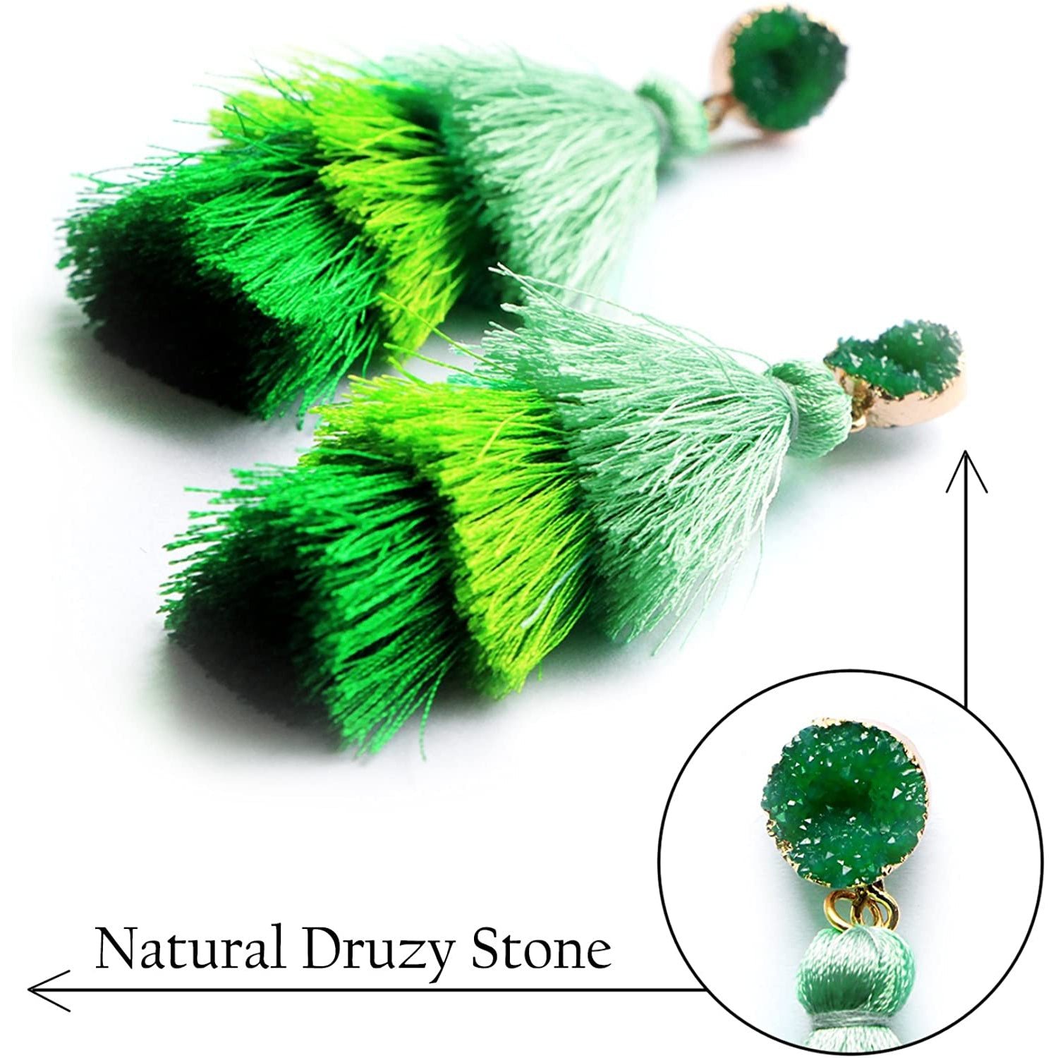 • These fun earrings featuring Natural Druzy Gemstone Studs and 3-Layer SILK Tassel Dangles in a voluminous. hula-skirt inspired shape