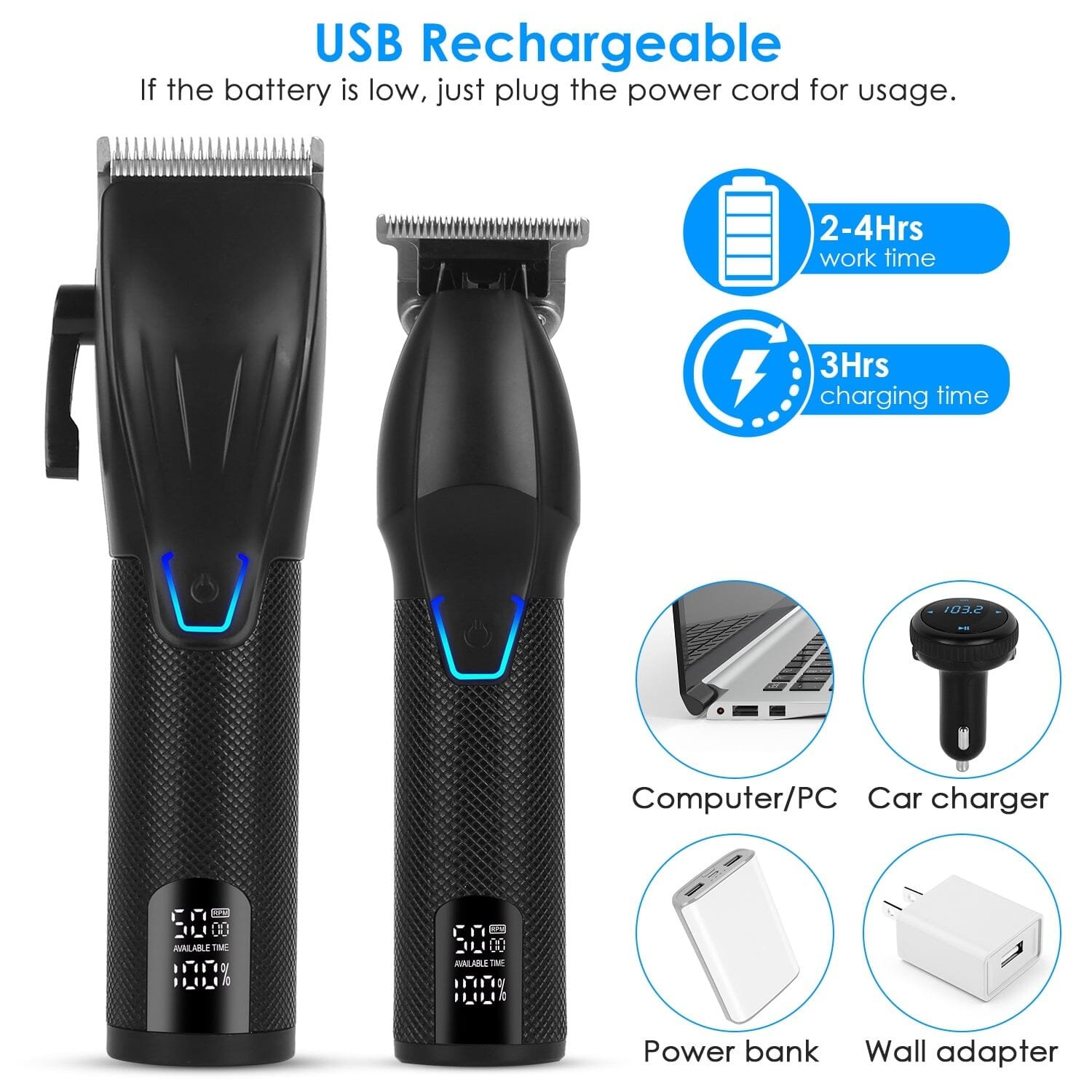 - Cordless: You can use this cordless clipper everywhere. After being fully charged for 3hrs. it can work continuously for 2-4hrs. If the battery is low. just plug the power cord for usage. Best for businessman or travelers.