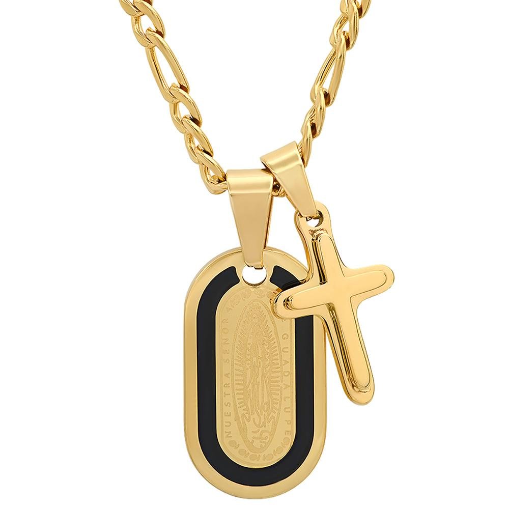 Men’sSilver or 18k gold plated stainless steeldog tag Lady of Guadalupe and Cross pendant.