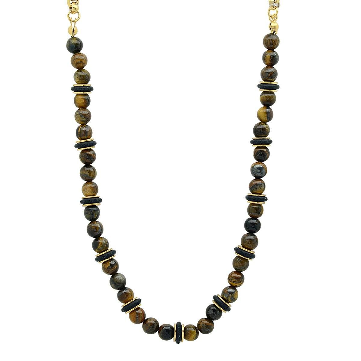 Men’s tiger eye. black rubber and 18k gold plated stainless steel box chain necklace