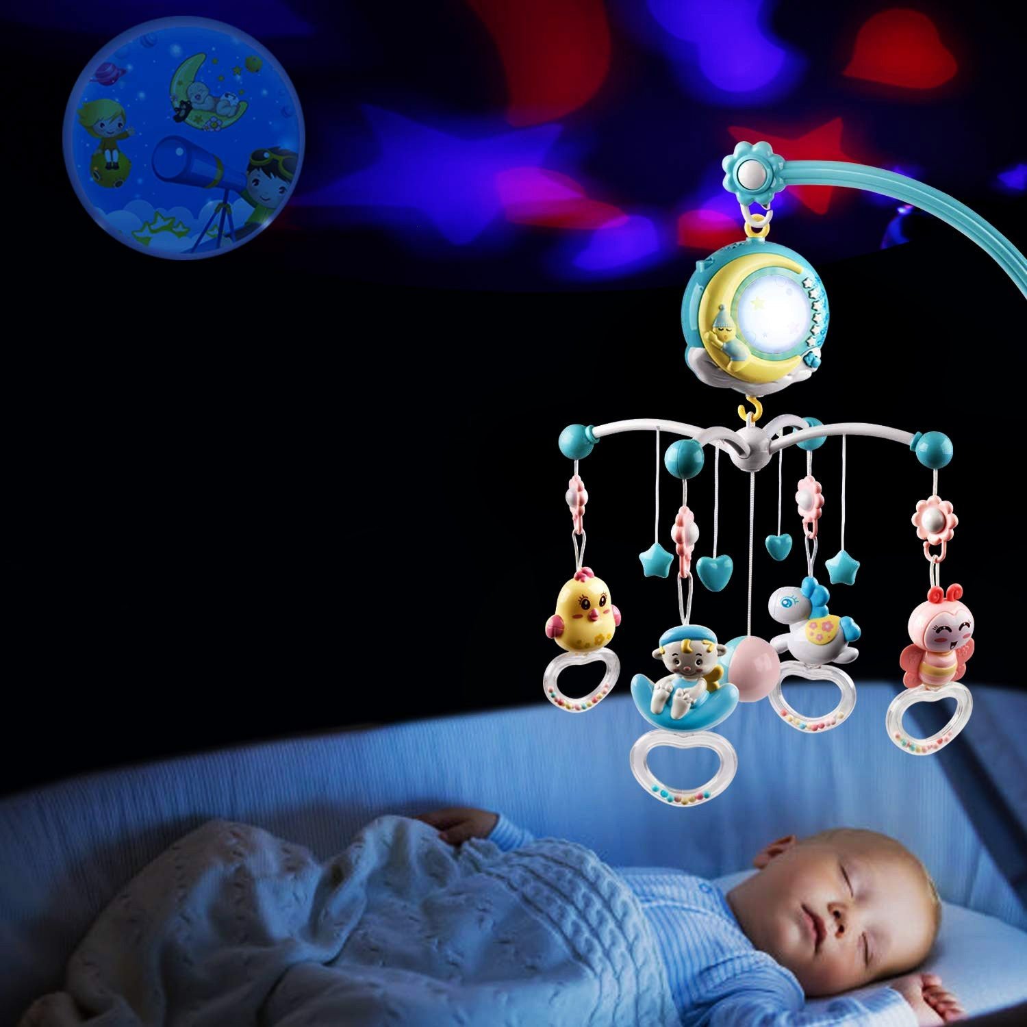 - Star Projector & Rotating Rattles: This baby nursery toy can project stars. moon and hearts of 2 modes: steady-on and flashing. and also project an image. The music box and colorful rattles are 360?? rotatable. improving your baby’ s perception of color and motion.
