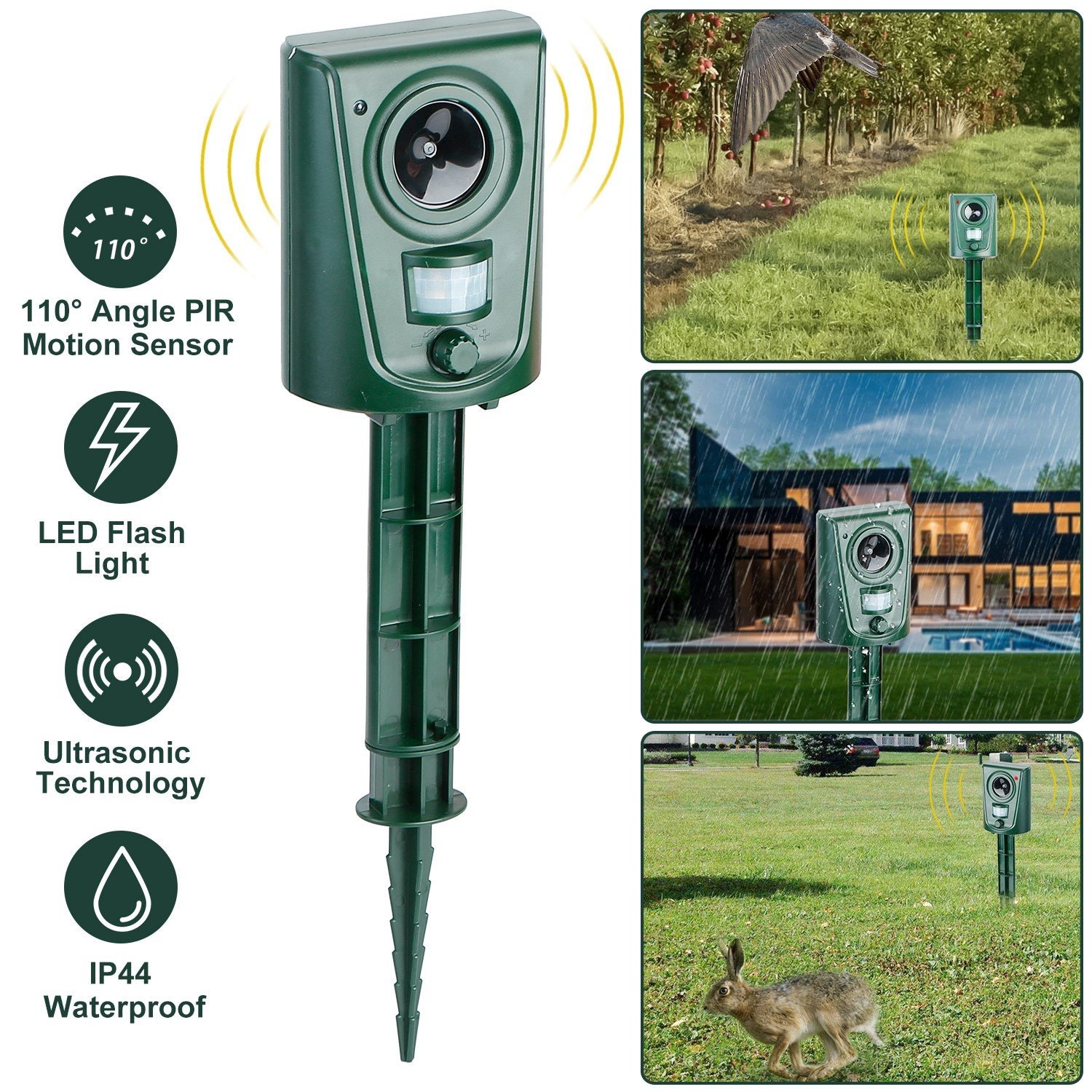 This ultrasonic animal repeller adopts advanced ultrasonic and PIR motion activated technology to offer you an optional solution for repelling unwanted animals or pests effectively by emitting powerful ultrasonic wave. It works about 20 seconds when detects motion then turns into stand-by mode. Its IP44 waterproof design allows it to be inserted outdoor such as gardens. farms. ponds without harm from rain and snow. You can simply insert it into the ground or hang it on a wall to protect your yard. patio. garage. attics. porches. boats etc.