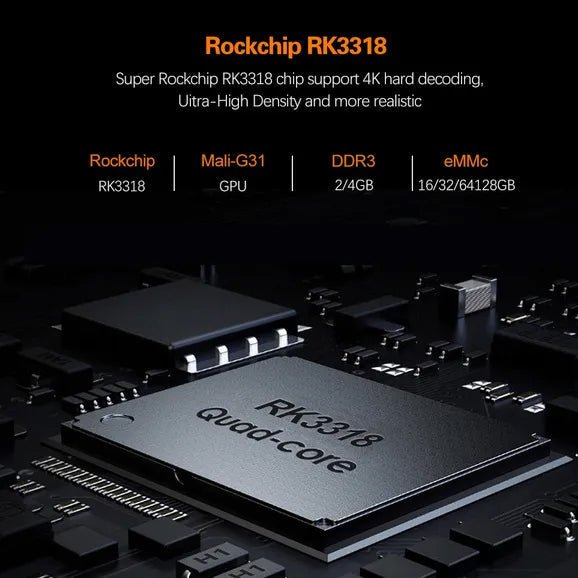 - Chipset: RK3318 Quad-Core 64bit Cortex-A53