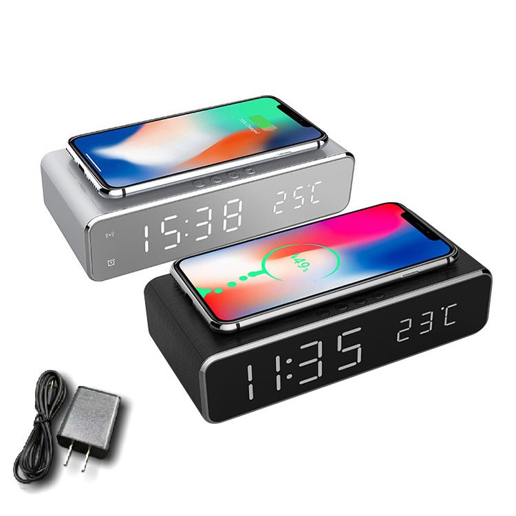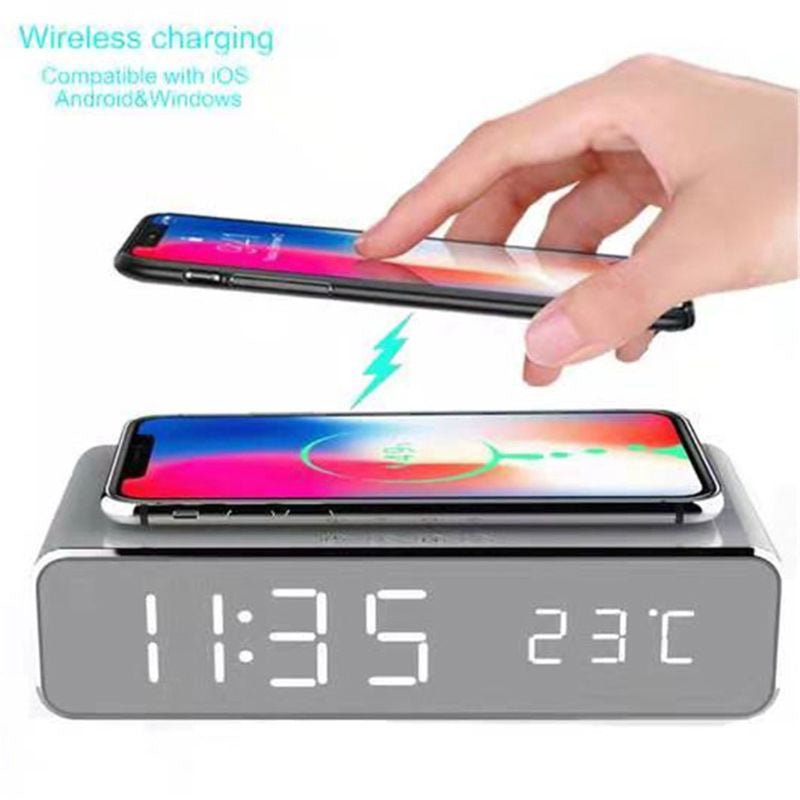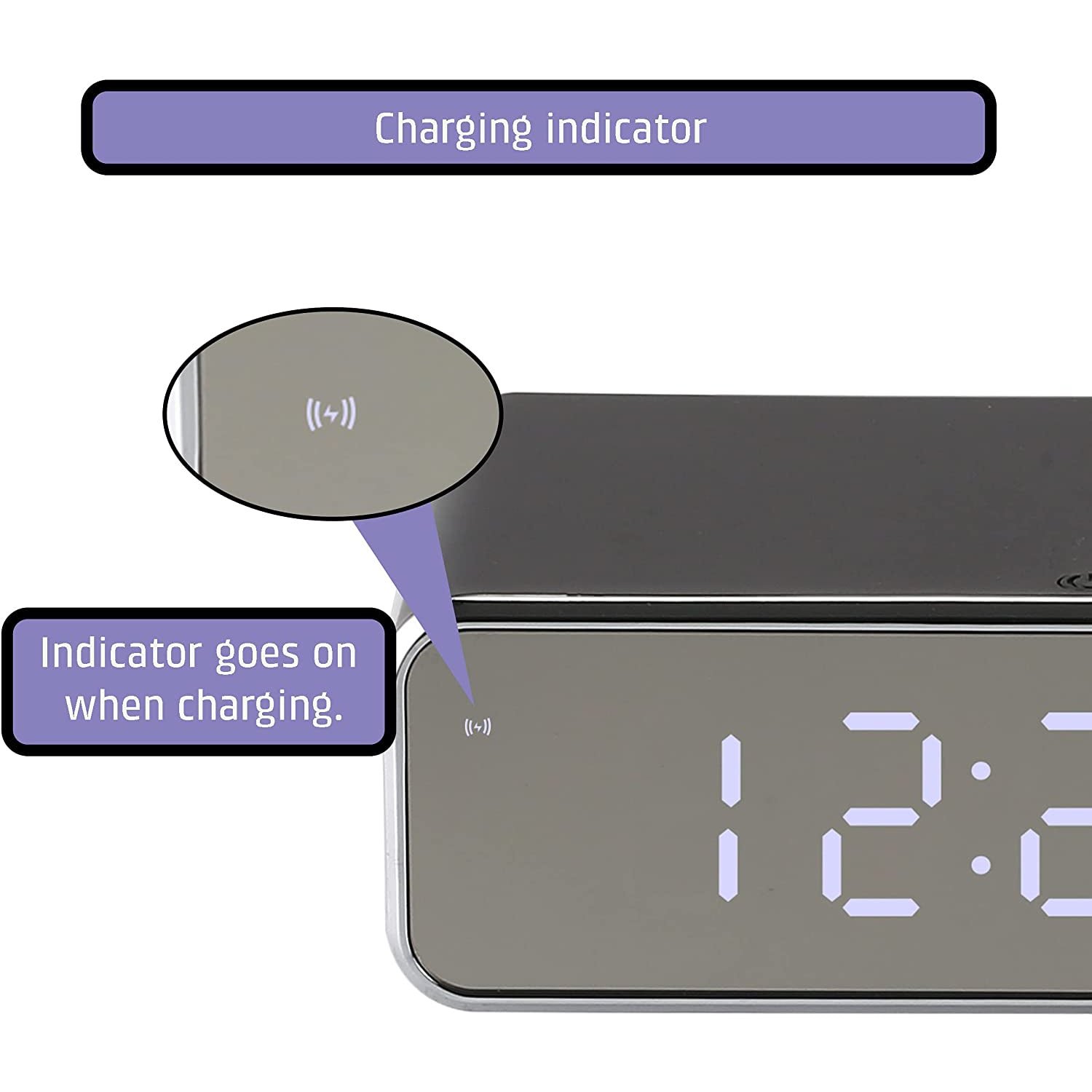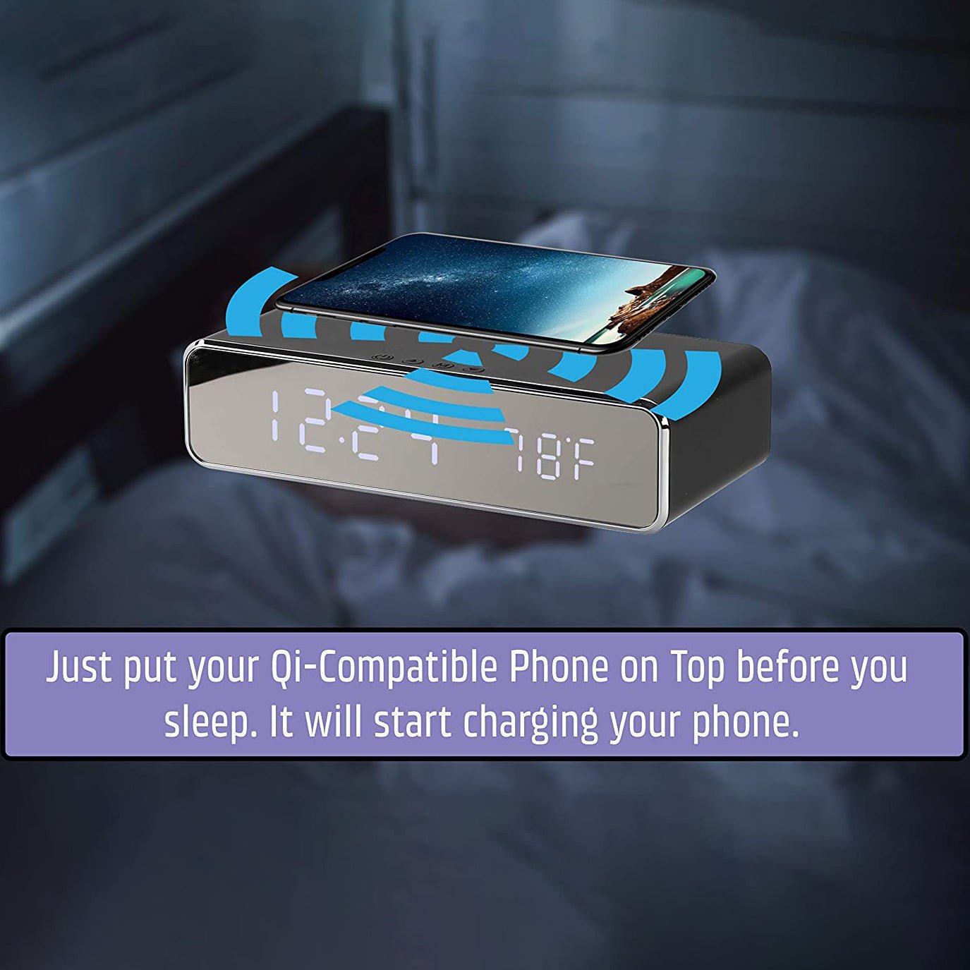 Charge your smartphone. and other Qi compatible devices. without the need to plug your device in to a wall charger or USB port. With portable LED digital display. mini mirror clock. digital thermometer. wireless charging transmitter. this small. compact and portable clock. can be used for home. office. and travel. Sleek modern elegant design for your nightstand. office desk. condo. living room.