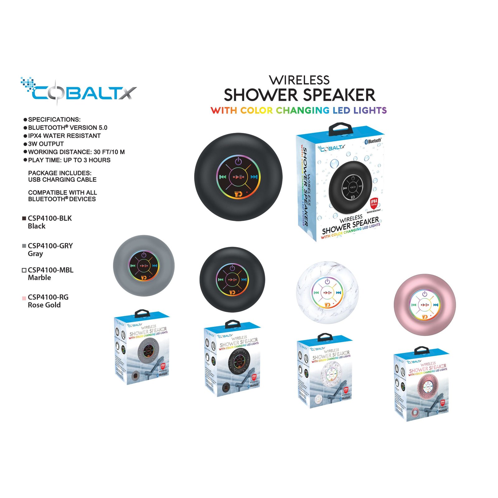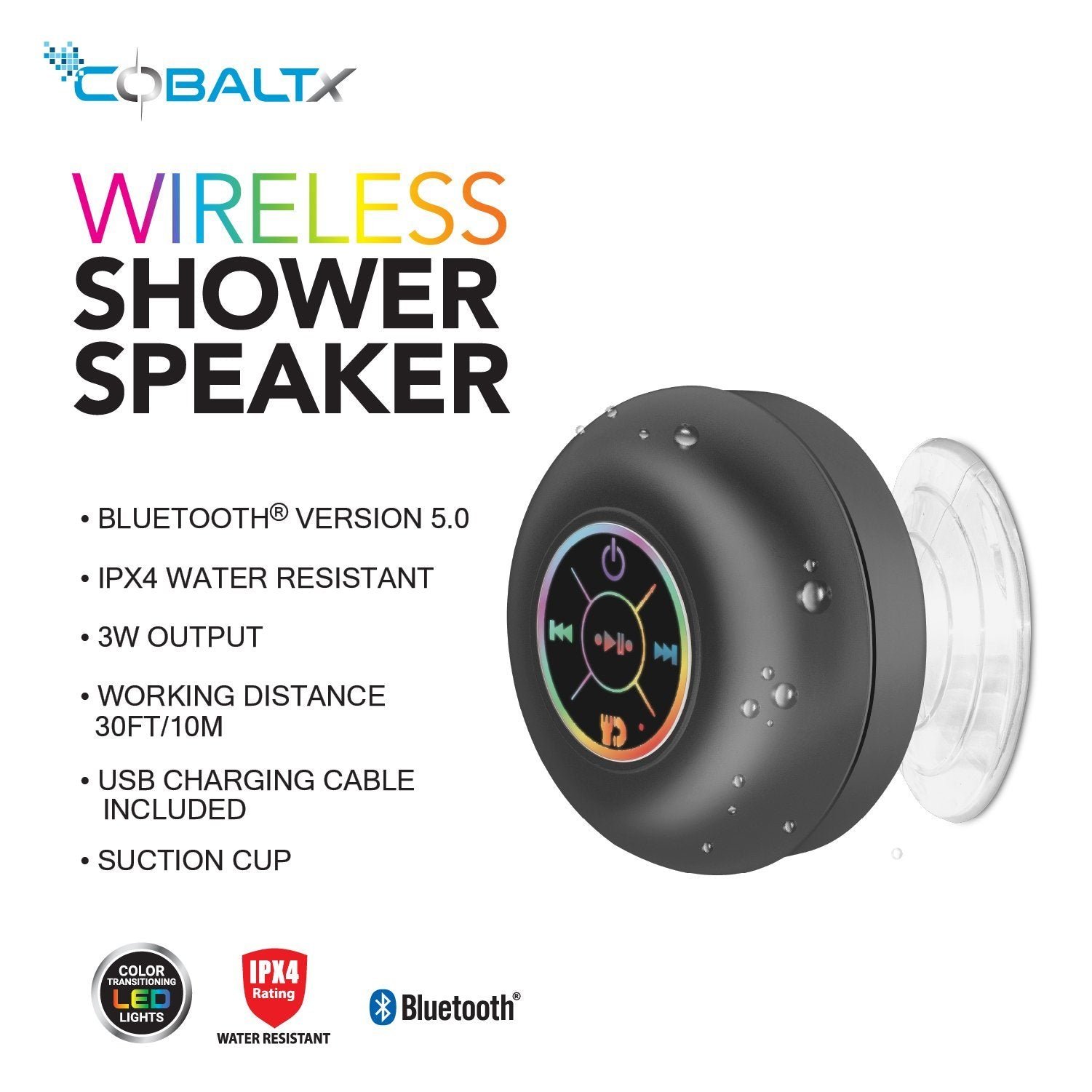 This is a unique and great wireless shower speaker with color changing LED lights. It has bluetooth version 5.0. it is iPX4 water resistant and has a 3W output. The working distance is up to 30FT and the playtime is up to 3 hours! It also comes with a suction cup so you can easily put it in the shower or tub and really enjoy it. Kids LOVE this.