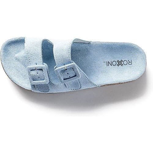 Roxoni Women Comfort Sandals Double Buckle Adjustable EVA Flat Slides Footbed Suede with Arch Support Non-Slip